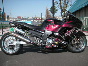 迫力の外観はメッキ仕様のシュートアウトアームに加え、オールペン、クロームメッキの各パーツに変更、プロドラッグの最高峰ロイアルレジェンドマフラーと、オリジナル燃調マップの組み合わせで200馬力を超える「ラム圧無し」パワーを発生、NOSを全開時に使用した場合、最大400馬力を超える凄まじい出力は、測定機にタイダウンで車両を固定するも、あまりの加速力に測定機のローラーの回転が追いつかず、リヤタイヤが空転し測定不能の事態に陥ります。ドラッグレースでは0〜400メートルを9秒台で走りぬき最速のZZR−1400に相応しい性能を有しています。