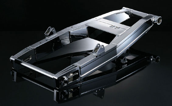 ロードレースと一線を画すドラッグレースのノウハウから開発されたスイングアームは巨大な出力に対応するため、最強のジュラルミンZ5Xの最高級クロームメッキ仕様の特注品を採用。